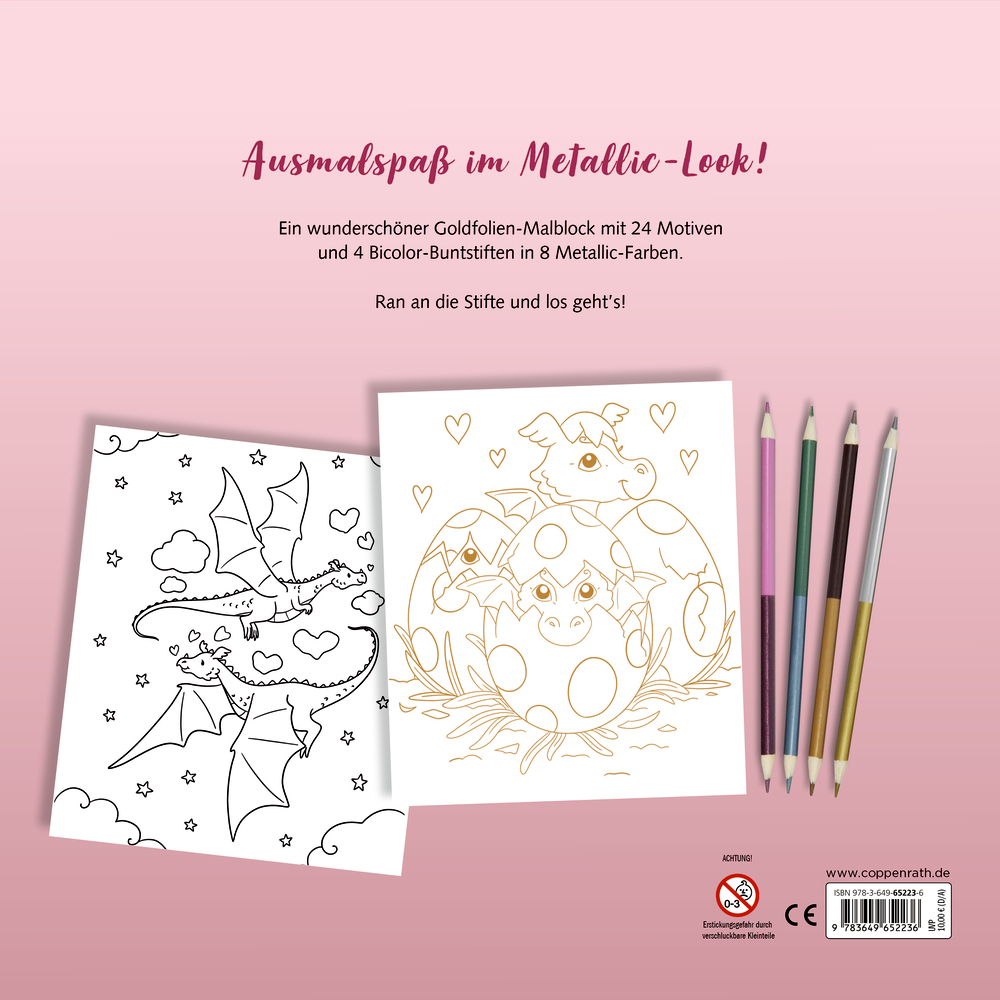 Inhalt: Malblock mit 48 Seiten, 4 Bicolor-Buntstifte (8 Farben, 4x Metallic)