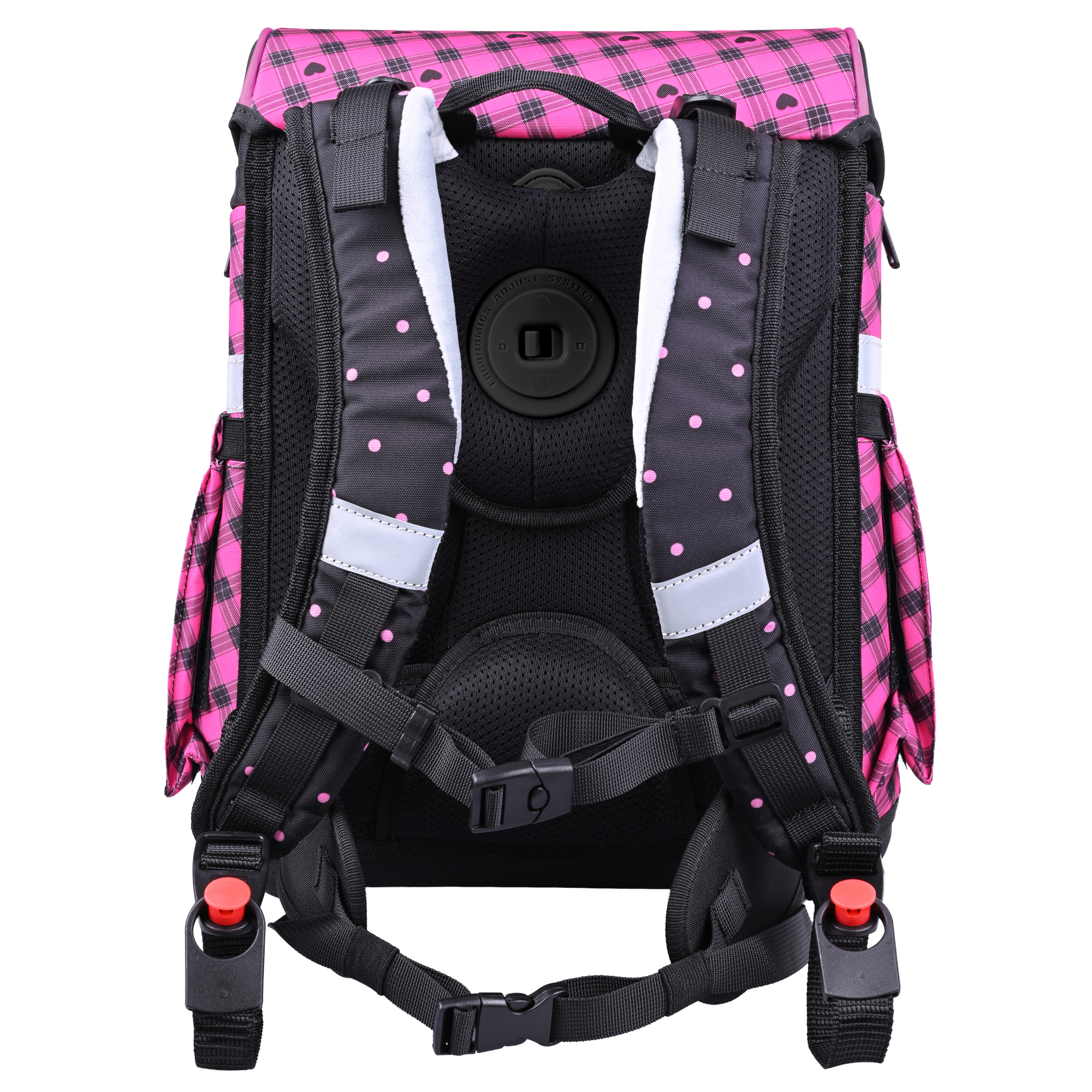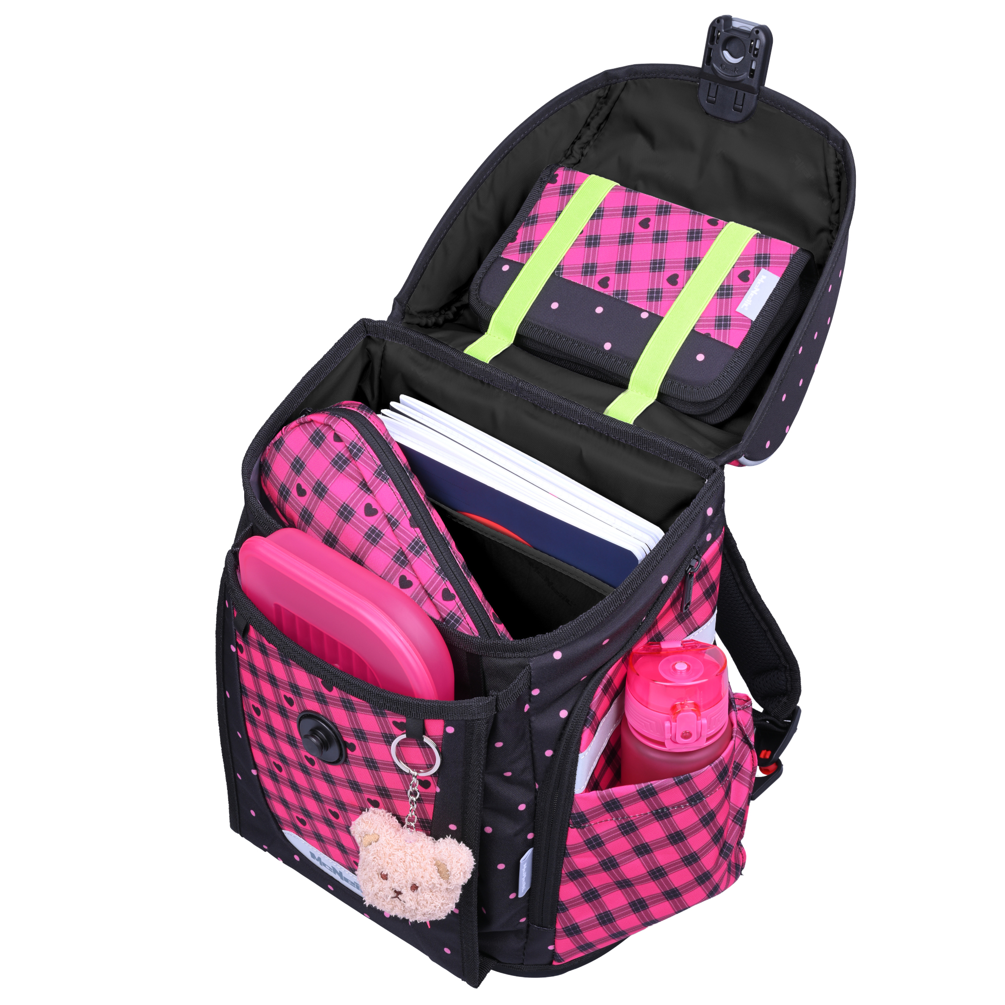 . Es punktet mit herzigem Karo Muster und großem Bären Motivmagnet sowie einem weiteren Magneten mit Herz zum Wechseln. Diese können ganz individuell am Schulranzendeckel angebracht werden. Zudem verfügt der Schulranzen über einen tollen Anhänger. Der
