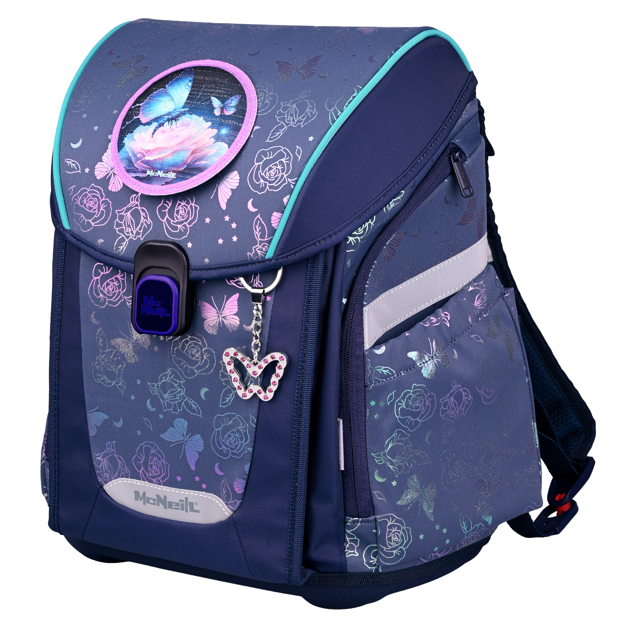 . Es punktet mit raffiniertem Muster und großem Schmetterling Motivmagnet sowie einem weiteren Magneten mit schwarzem Pferd zum Wechseln. Diese können ganz individuell am Schulranzendeckel angebracht werden. Zudem verfügt der Schulranzen über einen tollen Anhänger. Der