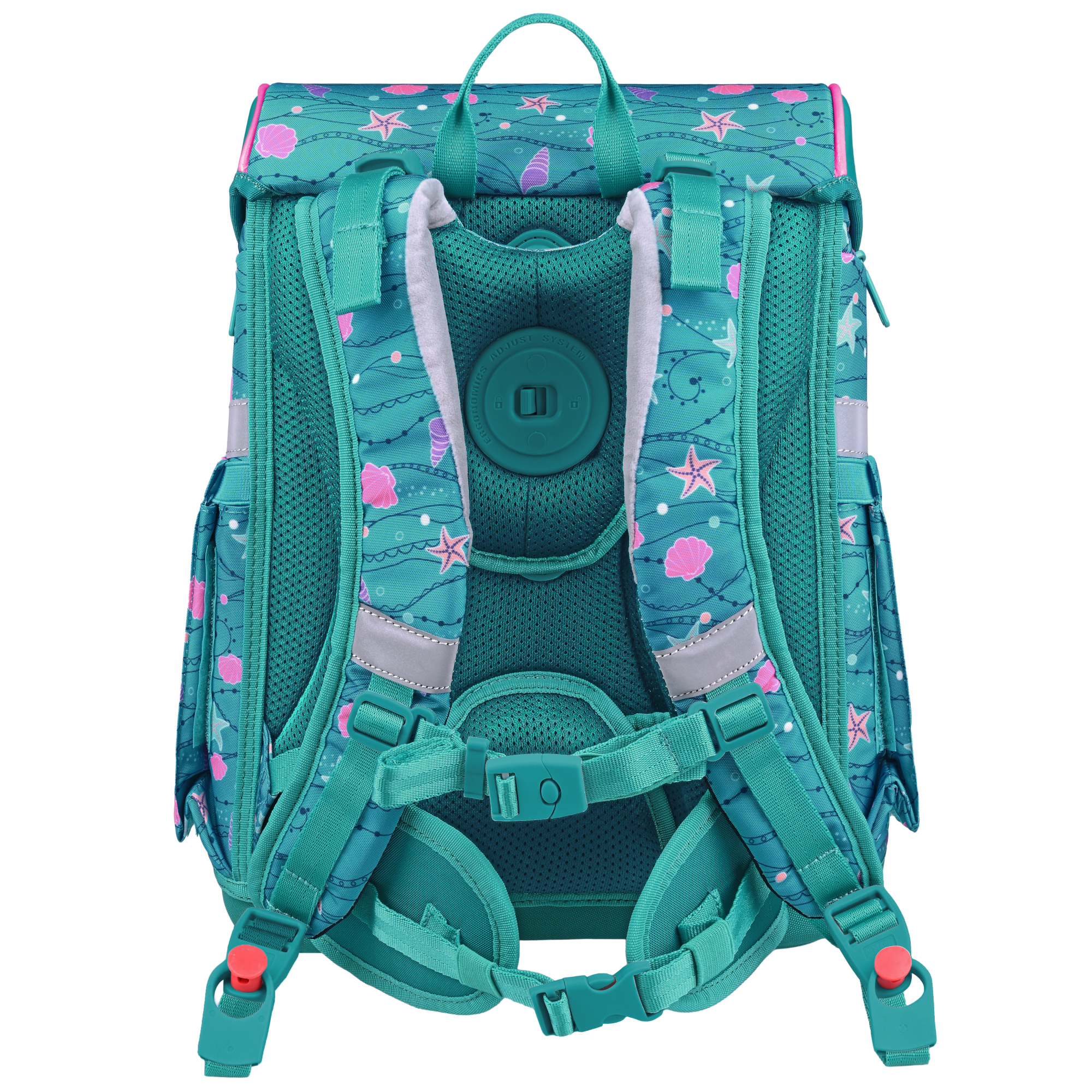 . Es punktet mit verspieltem Unterwasserwelt Muster und großem, glitzernden Seepferdchen Motivmagnet sowie einem weiteren Magneten mit Meerjungfrau zum Wechseln. Diese können ganz individuell am Schulranzendeckel angebracht werden. Zudem verfügt der Schulranzen über einen tollen Anhänger. Der