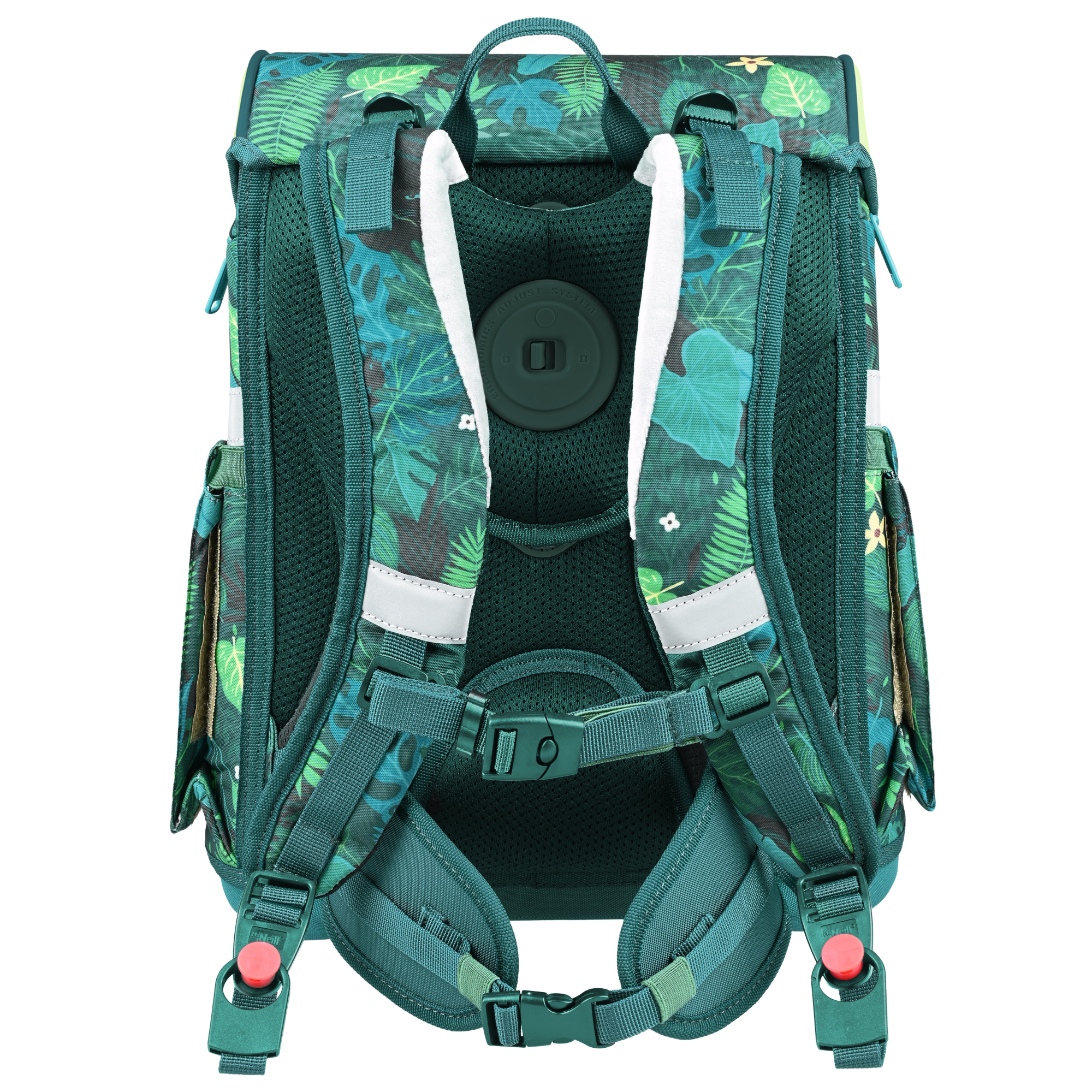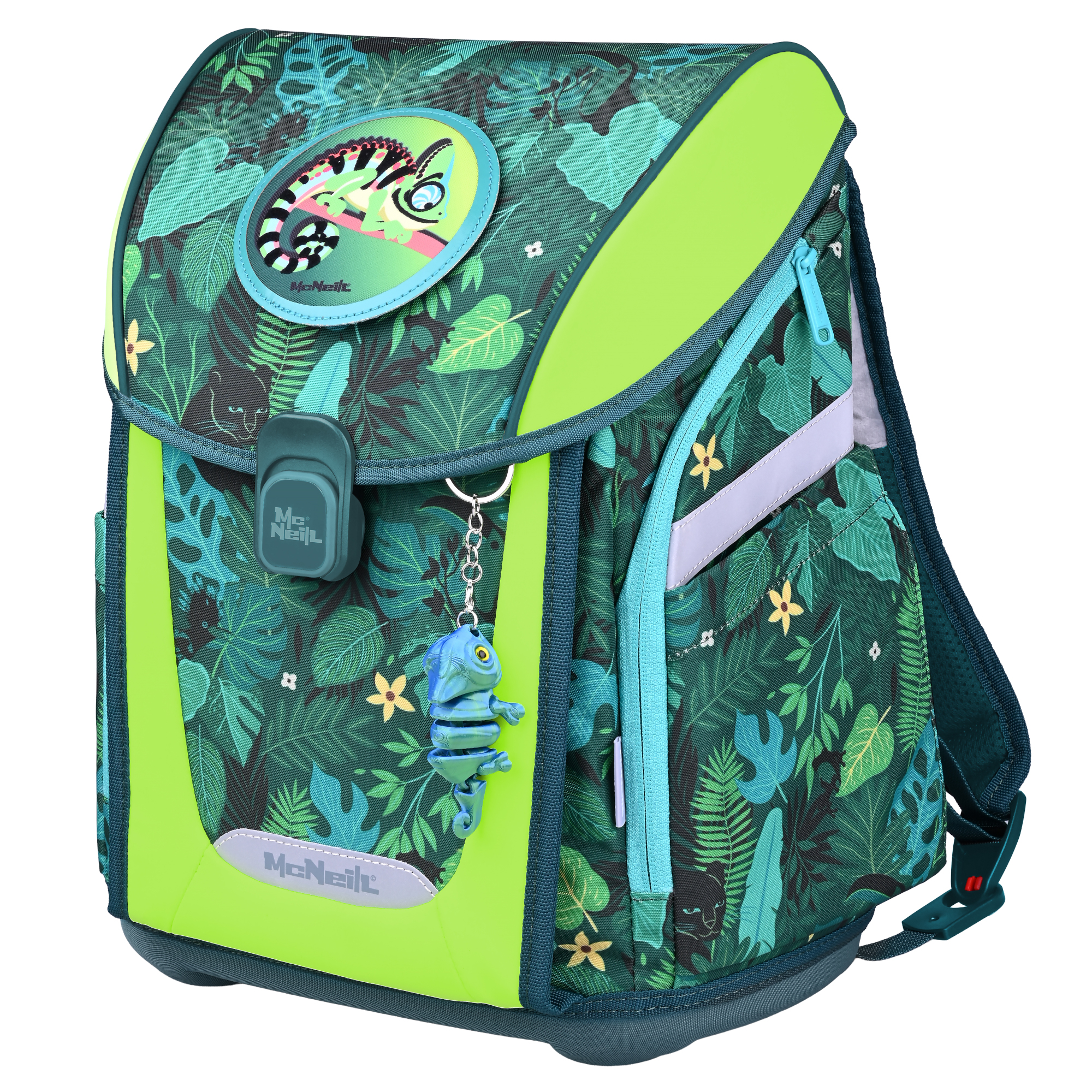 . Es punktet mit coolen Jungle Muster und großem Chamäleon Motivmagnet sowie einem weiteren Magneten mit Tiger-Motiv zum Wechseln. Diese können ganz individuell am Schulranzendeckel angebracht werden. Zudem verfügt der Schulranzen über einen tollen Anhänger. Der